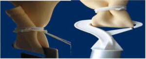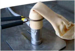 – Buộc chặt cổ bóng bằng dây mềm, thắt nút đoạn dây thừa rồi nhẹ nhàng tháo cổ bóng ra khỏi chén cân, móc dây vào chốt cố định dưới sàn bơm bóng; xếp gọn cổ bóng rồi gấp đôi lên lần nữa, buộc chặt; dùng mỏ tời luồn vào khe vừa gấp đôi ở cổ bóng (hình 3);